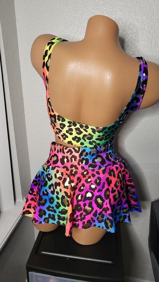 Includes jewel underbust top, high waisted mini skater skirt, and matching jewel garter. Add matching flare or fingerloop sleeves for $20!